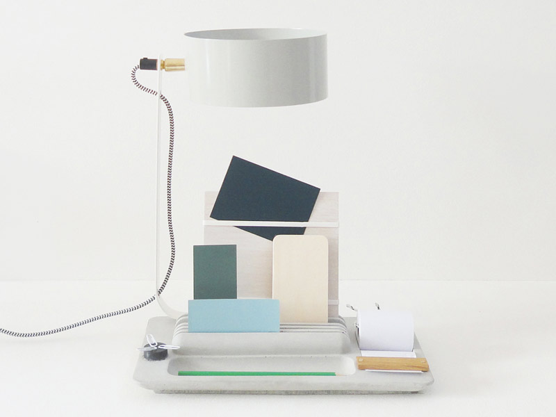 grey concrete, powder coated steel, wood, brass, cloth wire