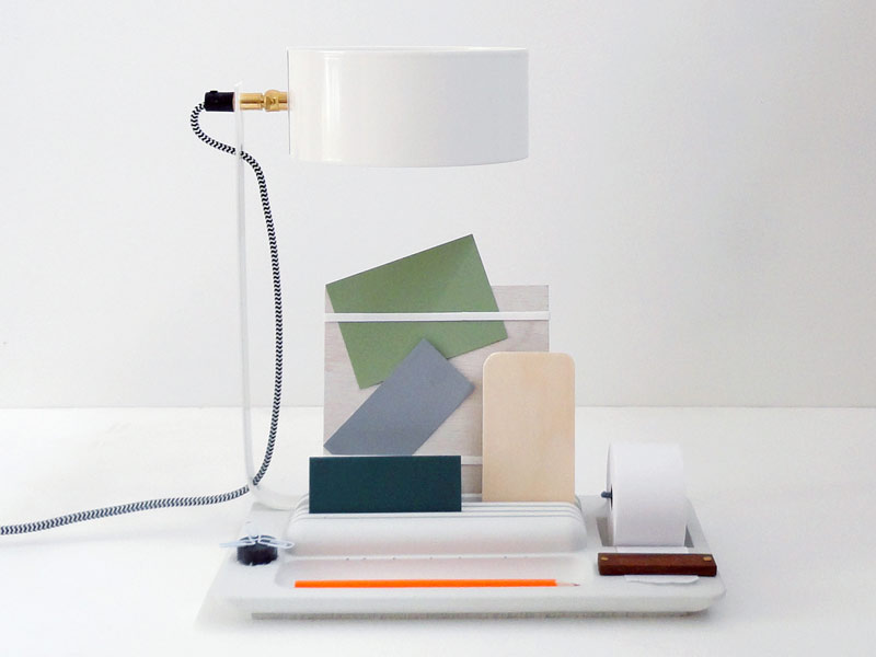 This table lamp helps you to stay organises. The base is handcasted with concrete which works very well with the wooden details en the brass parts of the lamp. In the foot of the lamp are notches where you can store cards and pictures. Another notch functions as a storage for pen and pencils. A magnet keeps your paperclips together. The classy black&white cloath wire underlines the timeless design of the lamp which blends in any interior.