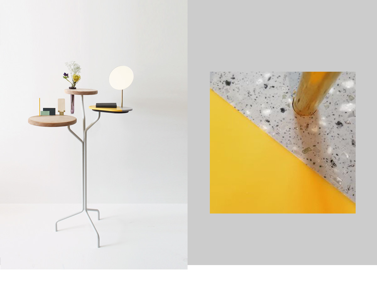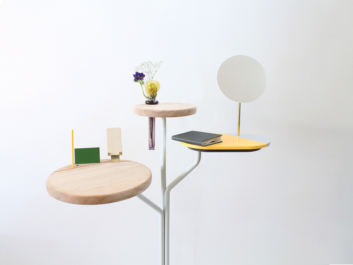 Thanks to its movable tabletops, the table easily adjusts to different spaces and to the user’s changing needs. The design comes with playful accessories that fit into the various holes and notches. Think of a mirror, a vase, and sleek folded-metal pieces that hold your mobile phone. These elements allow you to personalise the table in a way that suits your daily routines, making it well suited for a living room, entrance hall, or bedroom.
