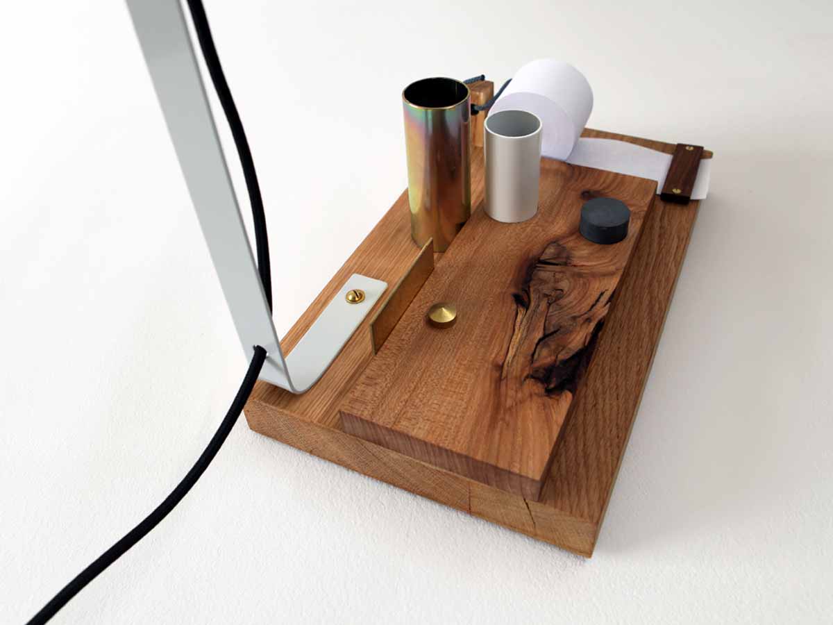 The design is not just a desk lamp but offers some practical features. You are able to put your pens and notes or pictures on it. Some lamps have a blue steel plate where you can put notes on with the aid of magnets. Another lamp has a paper roll for your things you shouldn’t forget.